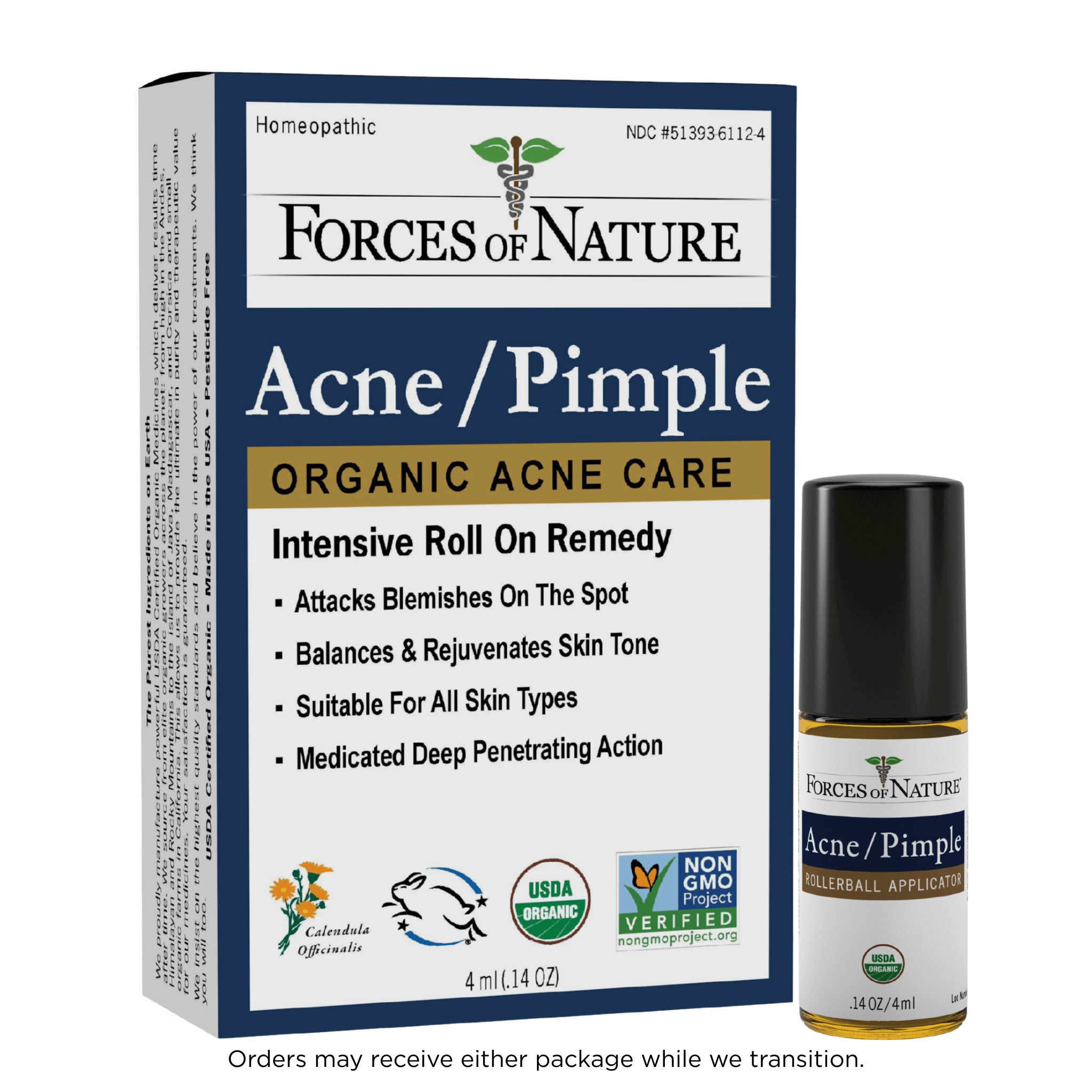 Forces of Nature Acne Control is a powerful remedy to clear breakouts and restore balance to troubled skin. Formulated with a unique blend of organic homeopathic medicines and essential oils. including Calendula Officinalis (Marigold) and Tea Tree. this formula absorbs into the skin to target pimples. blackheads. and whiteheads at the root while calming redness and swelling. Pure essential oils. like Rose Geranium. nourish irritated skin. Tough on blemishes but gentle on your body. it works to reduce inflammation. shrink zits. and support your skin’s natural healing process without the dryness. peeling. or harsh side effects that can be caused by synthetic chemical-based treatments.