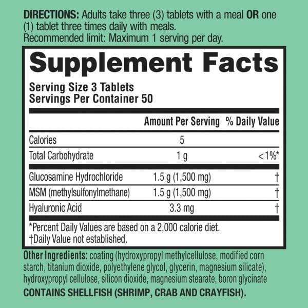 • 3 coated tablets provides 1500mg of Glucosamine. 1500mg of MSM and 3.3mg of Hyaluronic Acid
